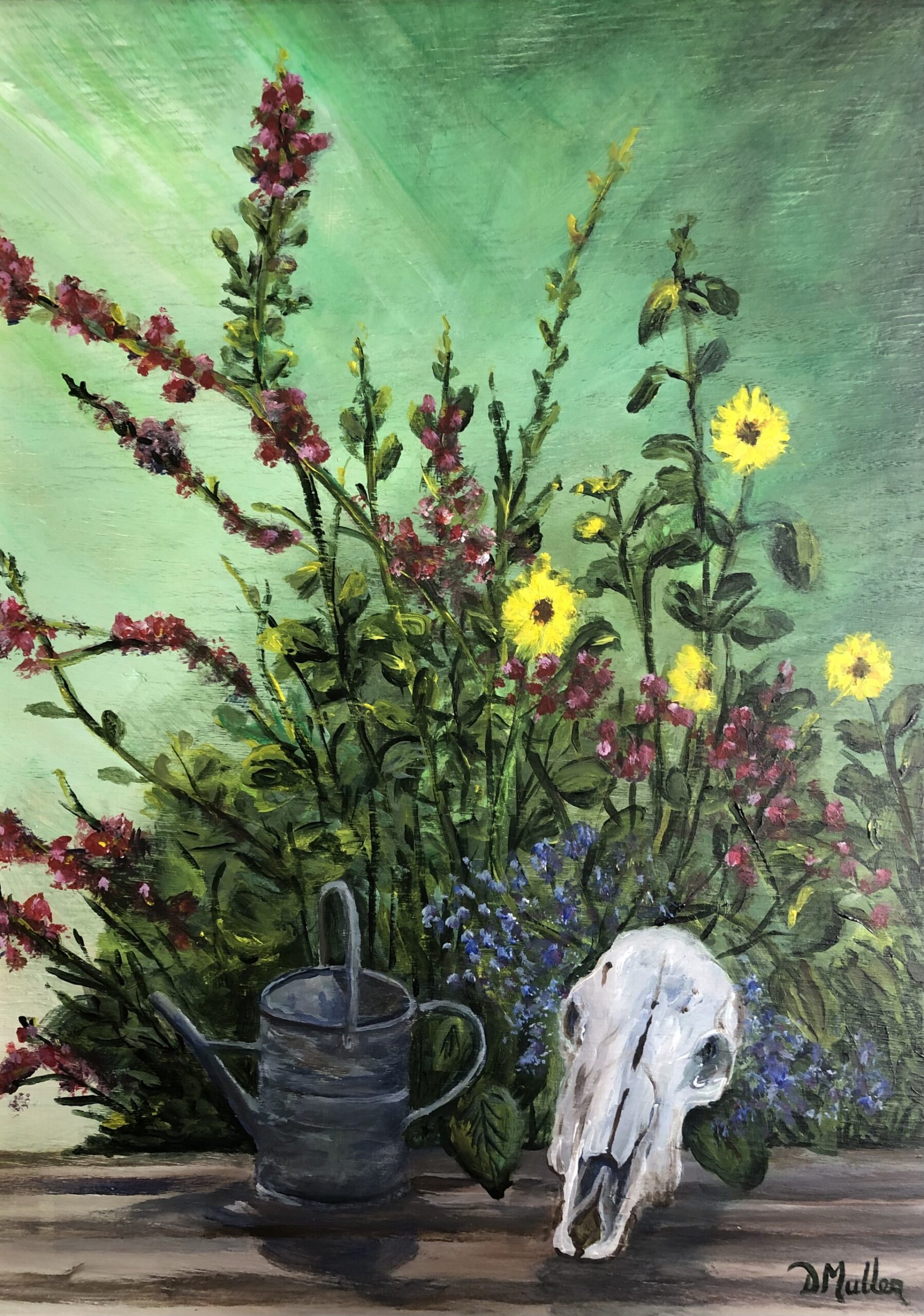 Watering can and skull, 12″ x 16″ acrylic painting on wood panel in wooden frame, $275.00